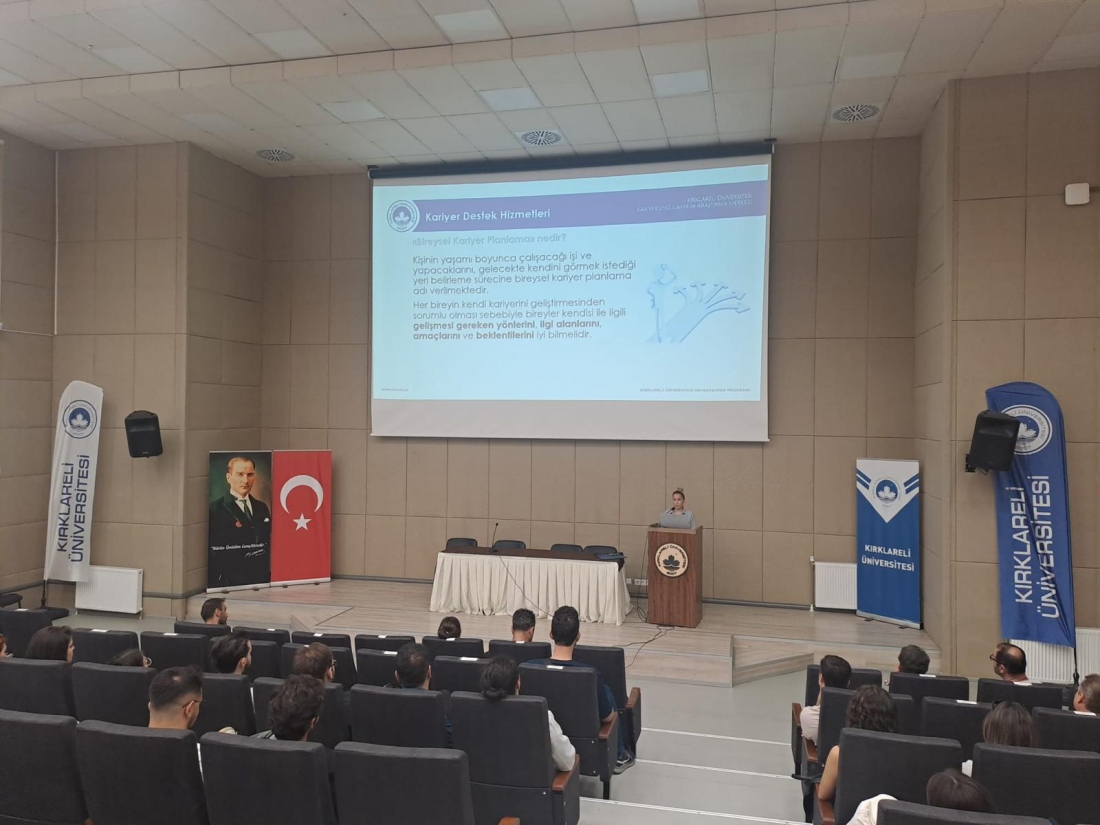 25 Eylül 2025 Perşembe günü Turizm Fakültesi Prof. Dr. Mustafa Aykaç Konferans Salonu’nda Kariyer Destek Hizmetleri Oryantasyon Programı gerçekleştirildi. Programda kariyer destek hizmetlerinin işleyişi, bugüne kadar yapılan ve devam eden eğitimler ile ilerleyen dönemlerde planlanan çalışmalar hakkında bilgi verildi. Katılımcılara yüz yüze ve uzaktan eğitim imkânları tanıtılarak kariyer belirleme sürecine ilişkin teknik detaylar aktarıldı. Öğrencilerin kariyer planlamalarında yararlanabilecekleri yöntemler ve süreçler üzerinde duruldu.