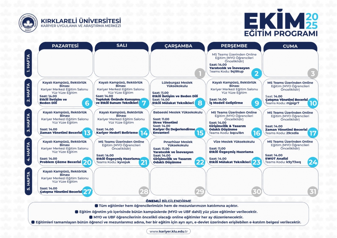 Üniversitemiz Kariyer Uygulama ve Araştırma Merkezi tarafından hazırlanan Ekim 2025 Eğitim Programı, kariyer merkezinin kullandığı kariyer yazılımı yetenekkapisi.org üzerinden yayımlanmıştır. Öğrencilerimiz ve mezunlarımız, Yetenek Kapısı portalına giriş yaparak program kapsamındaki eğitimlere başvuruda bulunabilir.