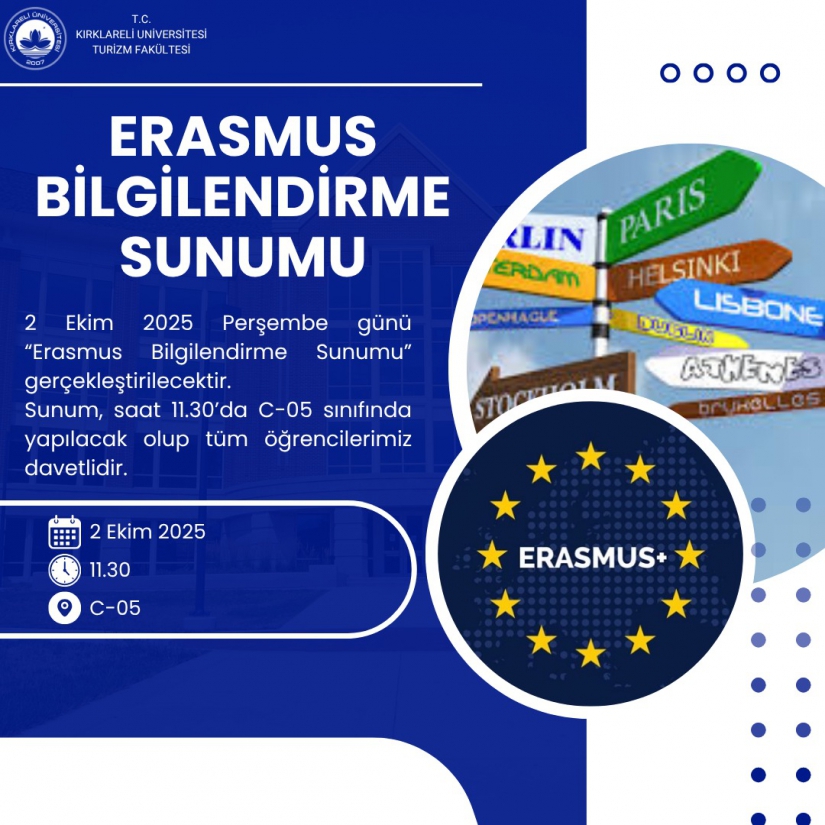 2 Ekim Perşembe günü Erasmus bilgilendirme sunumu gerçekleştirilecektir. Tüm öğrencilermiz davetlidir.